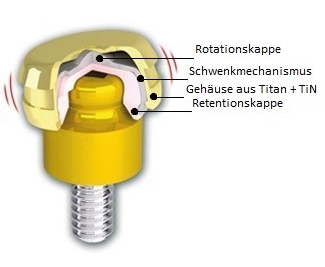 Die Matrizen bestehen aus einem Gehäuse aus Titan + TiN und einer von vier möglichen Retentionskappen. Die Retentionskappen bieten für jeden eine passende Haltekraft von 0,6 kg bis 2,7 kg.